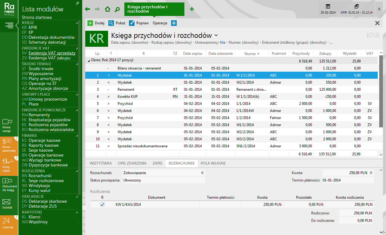 - ewidencja i rozliczanie rozrachunków, naliczanie różnic kursowych, integracja z zapisami księgowymi KPiR bądź EP oraz z zapisami VAT;